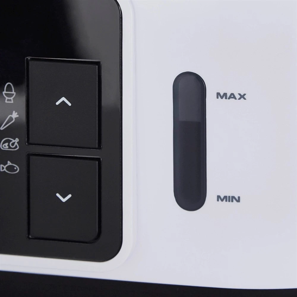 The 8 pre-set timings remove the guesswork of cooking times and can be set for each compartment. For true versatility, the pre-programmed times can be changed to suit your personal taste – so if you like your carrots crunchy for example, reduce the cooking time slightly. Intellisteam can be set to remember the last setting you use for each food group and select this automatically when the food group is chosen again. The easy-use digital display represents the three individual steaming compartments and enables you to easily set and see the remaining cooking time in each individual compartment.